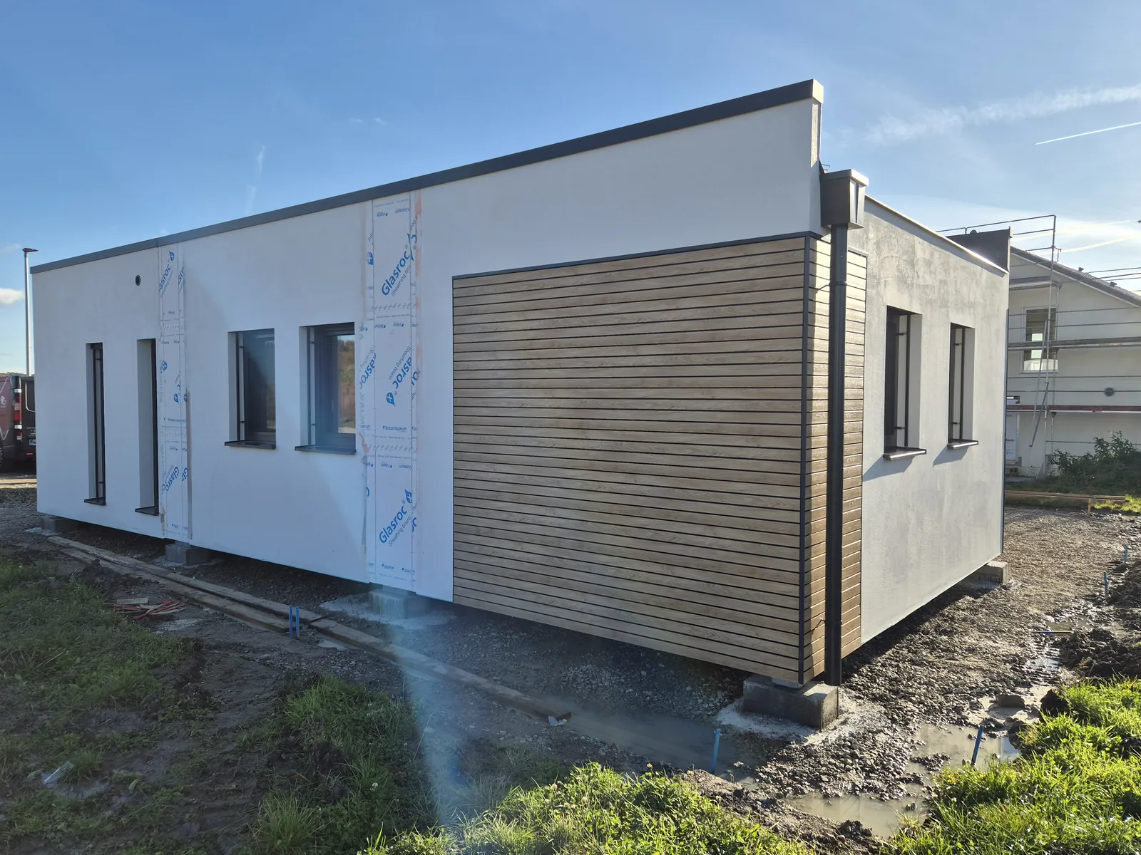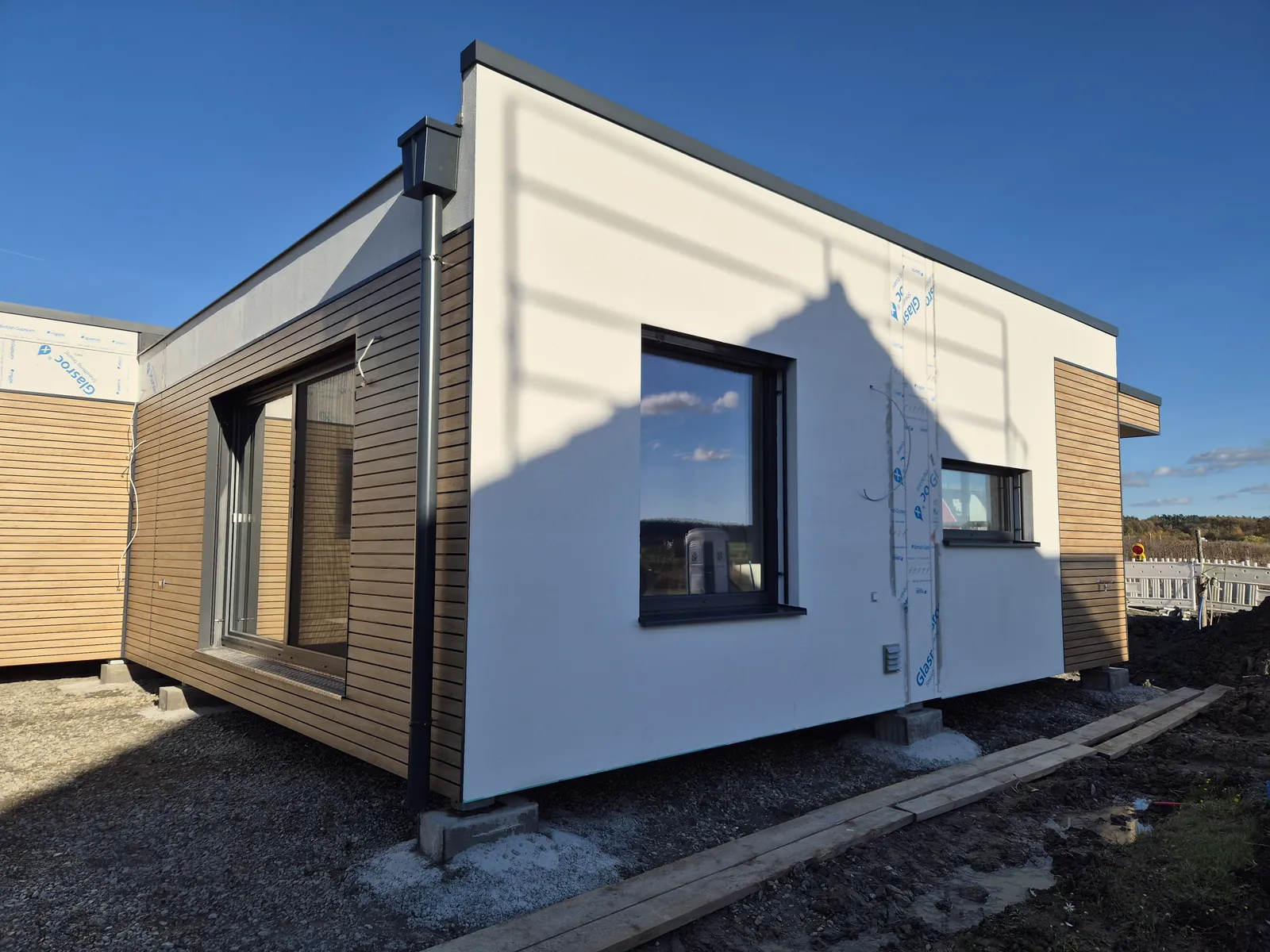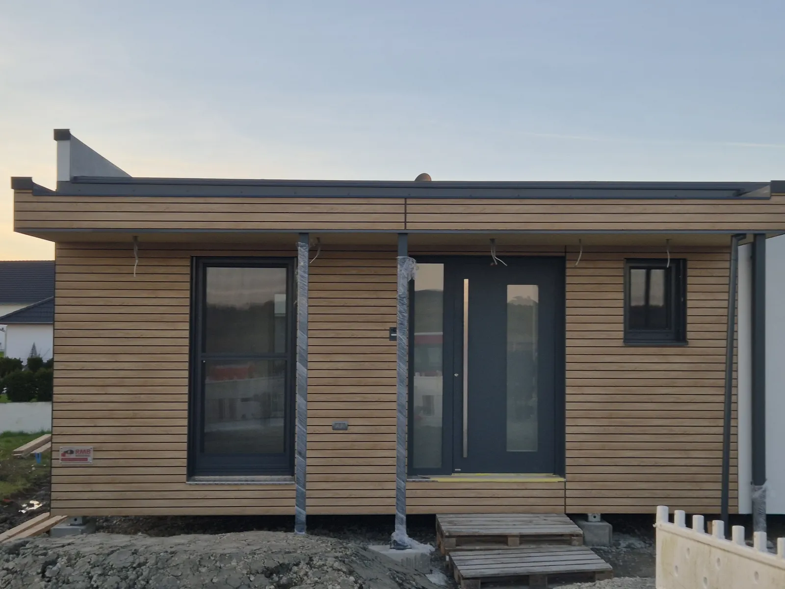 RMB MODUL 120 – Das Raumwunder in Colmberg, Deutschland steht für großzügiges Wohnen in moderner RMB Modulbauweise. Mit ca. 106 m² Wohnfläche aus drei Modulen bietet dieses Modulhaus ein komfortables Wohnkonzept für Paare oder Familien mit Anspruch an Raum, Design und Nachhaltigkeit. Das Fertighaus wurde ohne Bodenbeläge und Endmalerei geliefert und ermöglicht dadurch einen individuellen Innenausbau nach eigenen Vorstellungen. Diese Ausführung unterstreicht die hohe Flexibilität der RMB Modulbauweise. Zur Ausstattung gehören ein Badezimmer und ein separates WC mit hochwertiger Sanitärausstattung, eine integrierte Fußbodenheizung sowie der Anschluss an externe Heizsysteme für eine flexible Energieversorgung. Ergänzt wird das Gebäude durch ein passendes RMB Vordach.