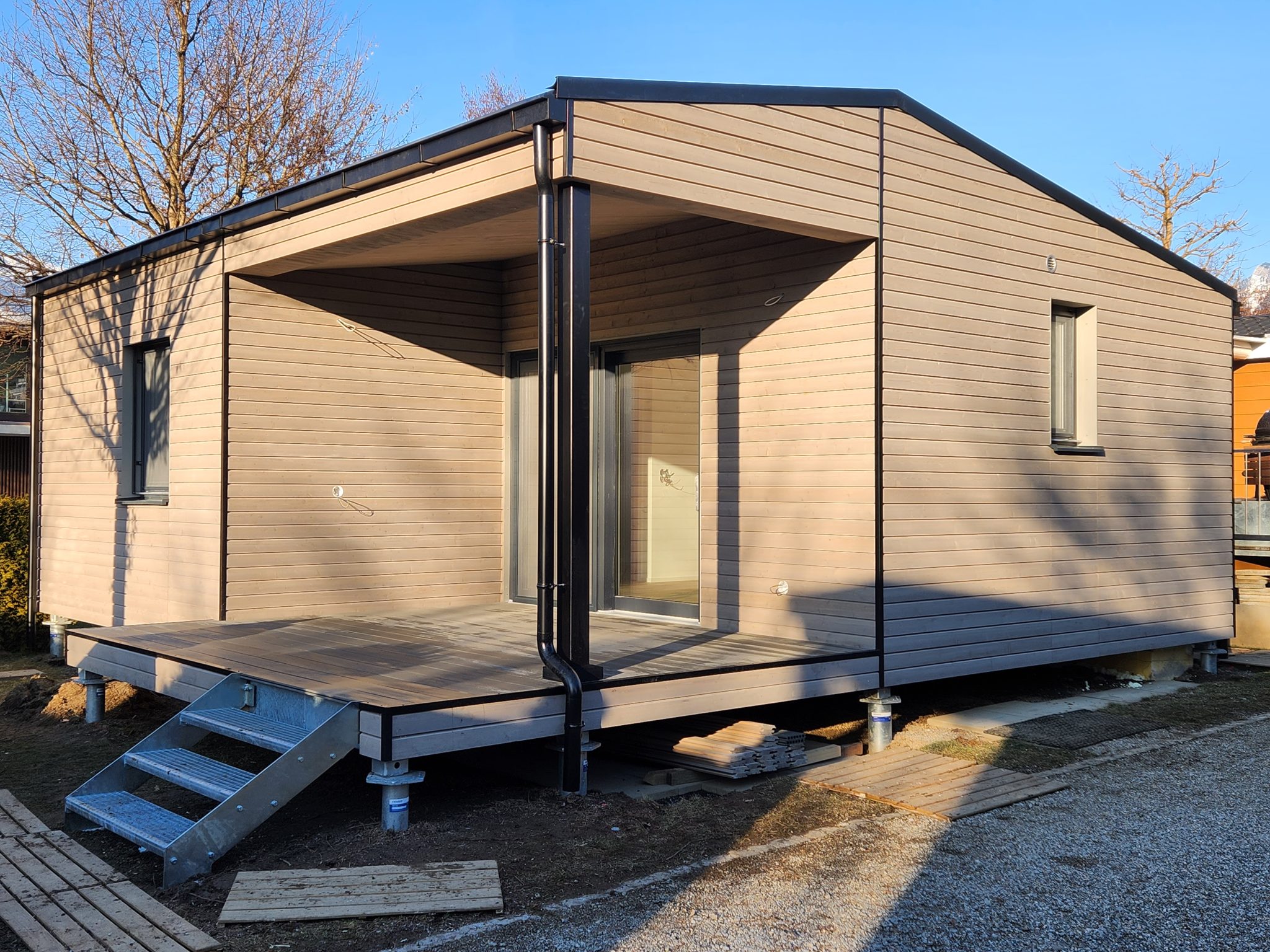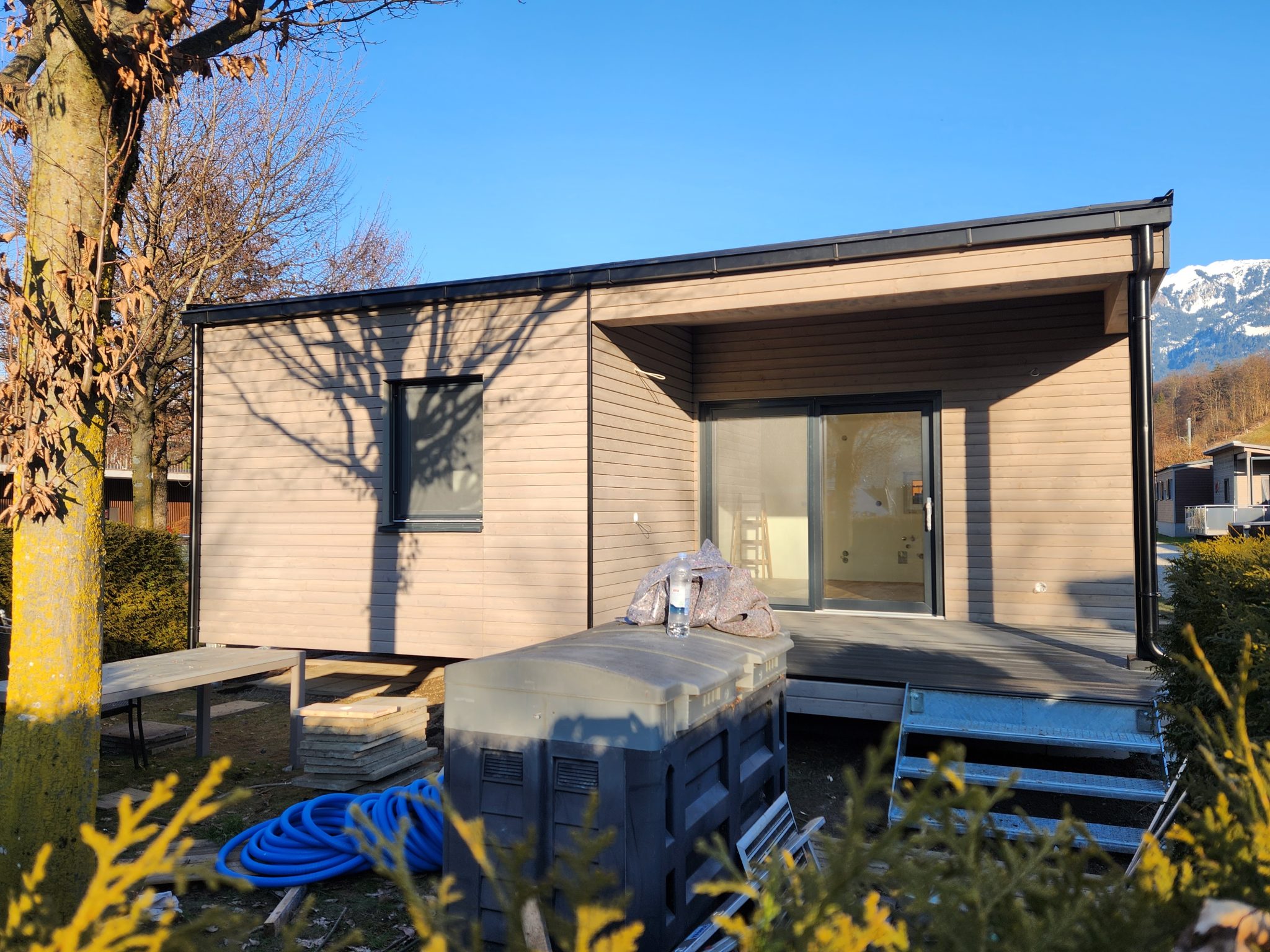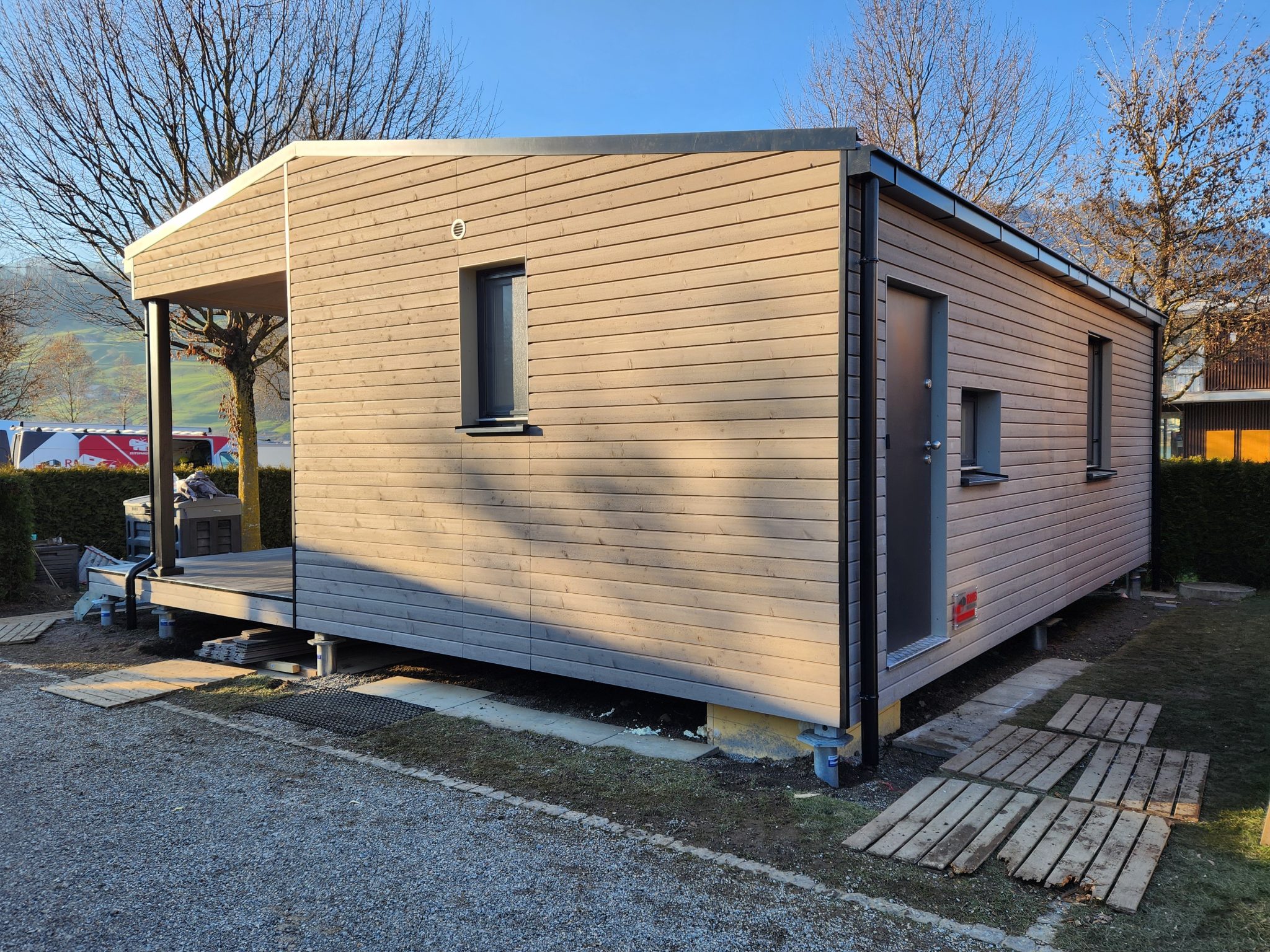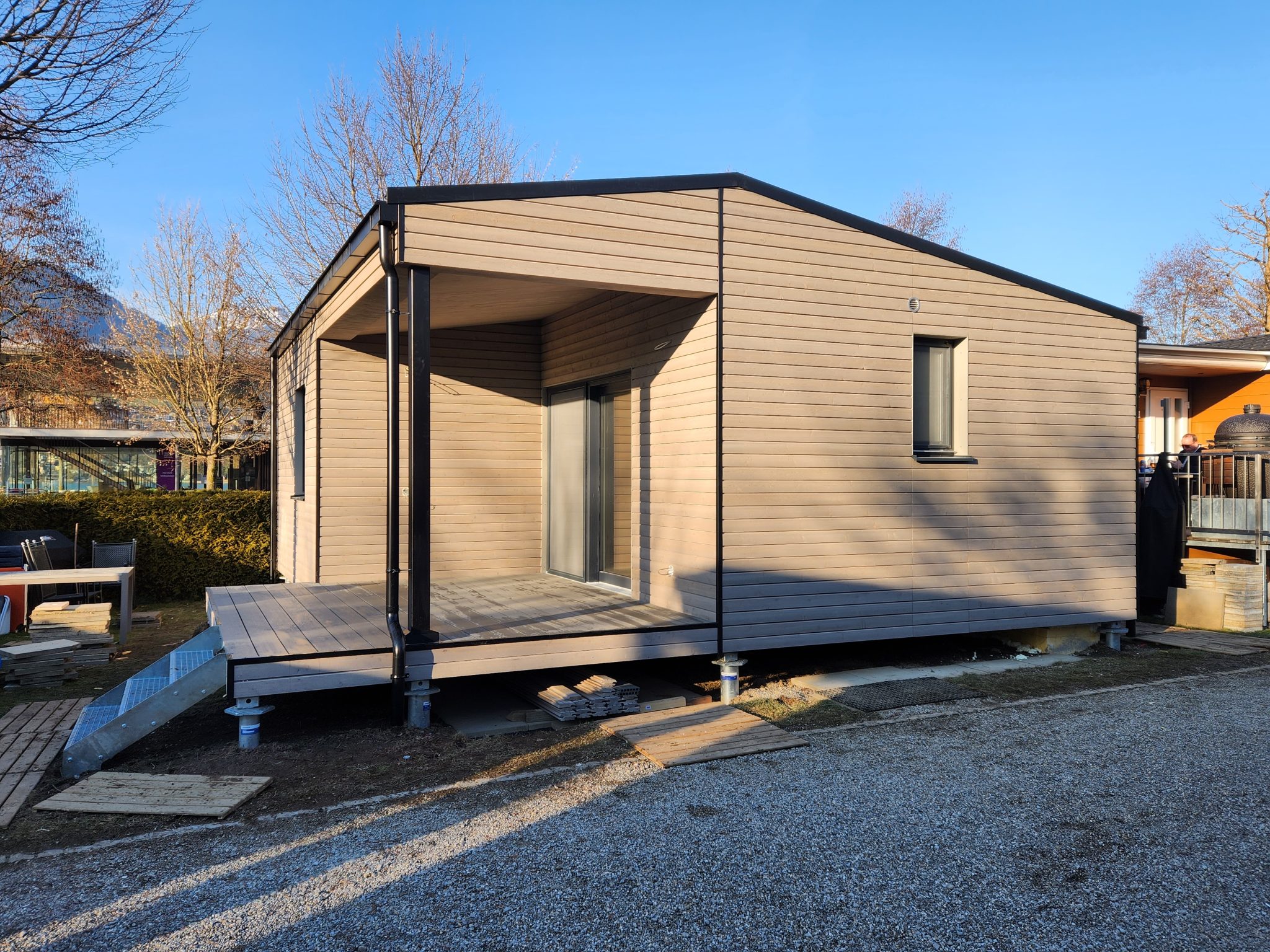 RMB Modul 45 – das Schweizer Haus – Ferienhaus, Seefeld Park, Sarnen, Schweiz ist ein perfekt gestaltetes Modulhaus, das Funktionalität und Ästhetik vereint. Mit seinem innovativen Design und seinen nachhaltigen Lösungen ist es das ideale Zuhause für alle, die ein modernes Wohnen in der wunderschönen Umgebung der Schweizer Alpen suchen. Das 36,2 m² große modulare Ferienhaus ist flexibel an die Bedürfnisse der Nutzer angepasst, energieeffizient und schnell aufgestellt. Mit seiner Lage im Seefeld Park in Sarnen bietet es einen außergewöhnlichen Blick auf die Natur und erfüllt gleichzeitig alle Anforderungen an ein modernes Wohnen im Einklang mit der Umwelt. Ein integriertes Satteldach mit sichtbarer Decke, eine überdachte Terrasse mit Holzdecke und Einbaumöbel sind nur einige der Merkmale dieses Holzhauses, die ihm den Hauch eines CHALETs verleihen.