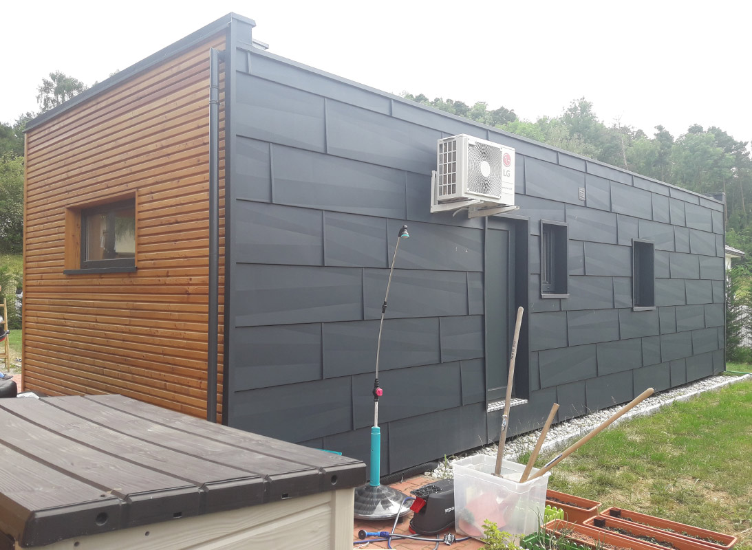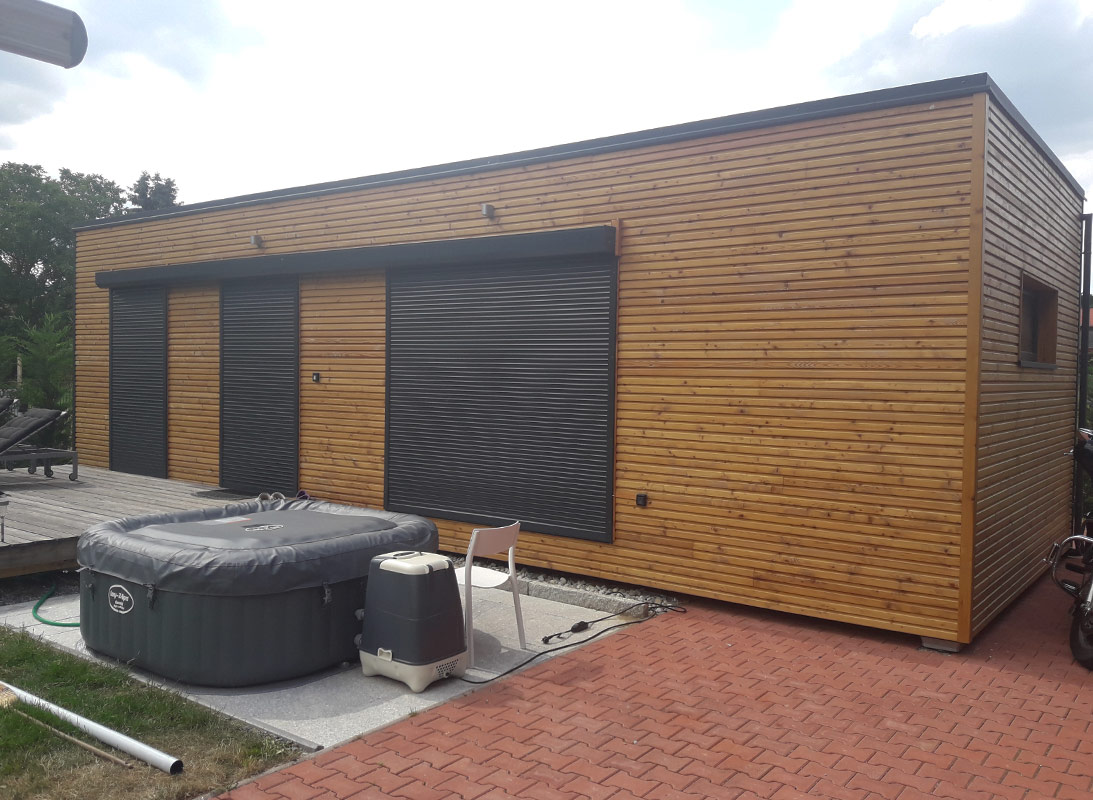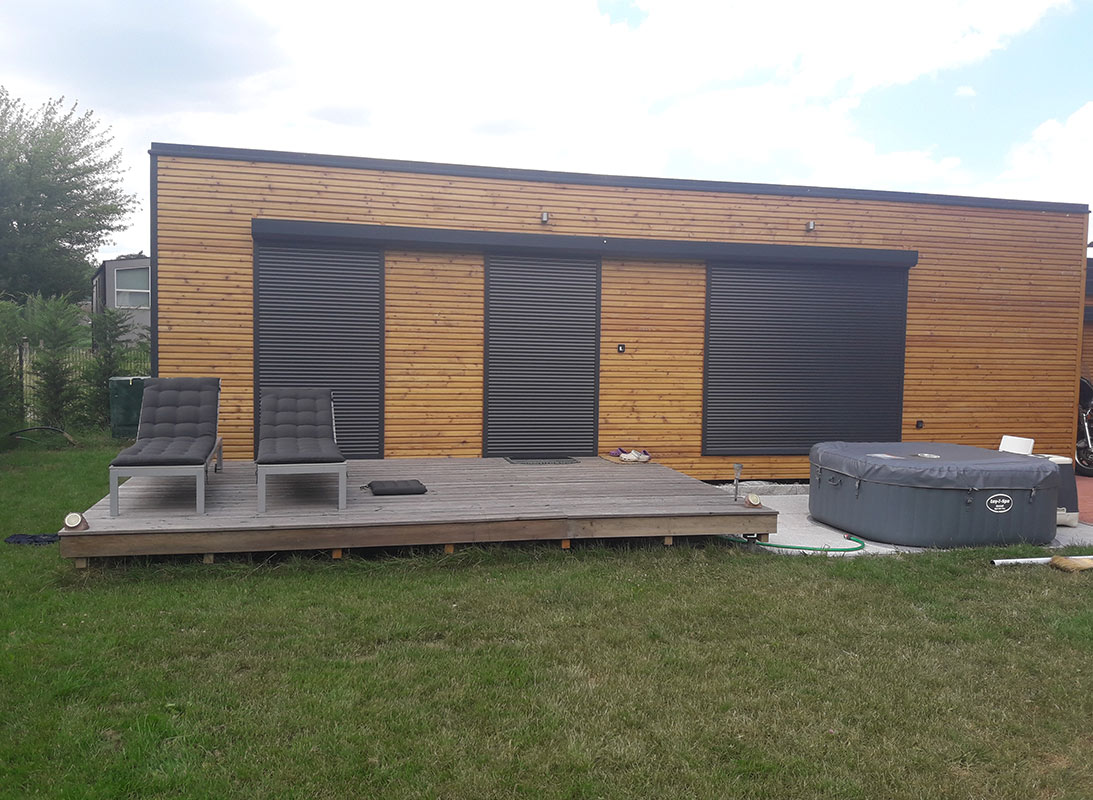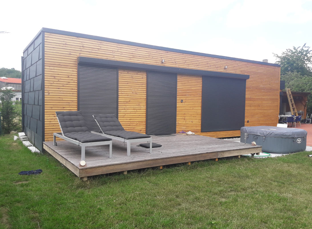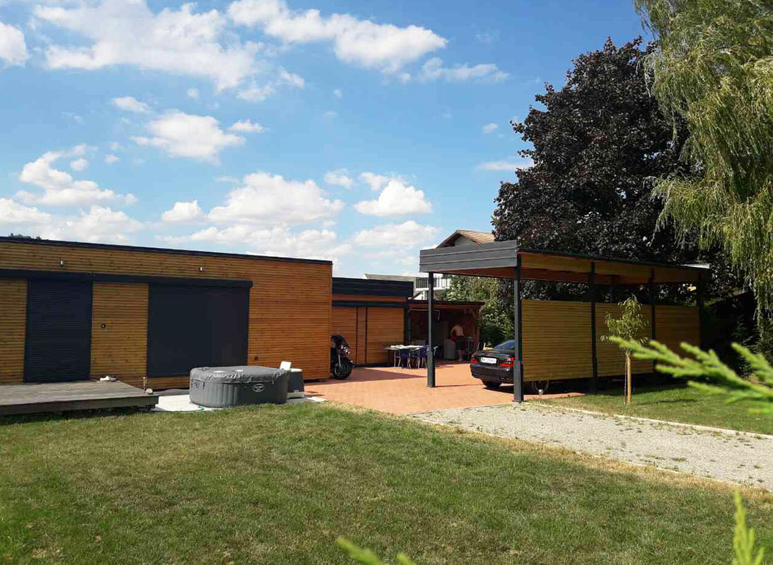 RMB Modul 60 – Sitzenberg-Reidling, Österreich ist ein kompaktes, aber äußerst funktionales modulares Tiny House für diejenigen, die Komfort auf kleinem Raum suchen. Mit 60 m² Fläche bietet es ausreichend Platz für einen angenehmen Aufenthalt mit Wohnzimmer, Küche, 2 Schlafzimmern, Technikraum und Bad. Der gesamte Wohnbereich des Modulhauses wird durch eine Terrasse erweitert, die durch größere Glasflächen zugänglich ist. Der modulare Aufbau des Fertighauses ermöglicht eine schnelle Aufstellung, Anpassung an Kundenwünsche und eine hohe Energieeffizienz. Neben dem modularen Ferienhaus wurde ein Carport für das Wohnmobil sowie ein Schuppen für die Kundenmotorräder produziert und aufgestellt – alles im Einklang mit der Ausführung des Holzhauses. Dieses Projekt kombiniert modernes Design mit rationeller Raumnutzung, ideal für kleine Familien oder Einzelpersone